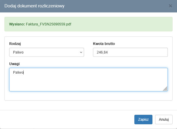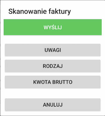 Po dodaniu zdjęcia należy wybrać rodzaj dokumentu oraz uzupełnić kwotę brutto. Można również wpisać dodatkowe informację pod przyciskiem "Uwagi".