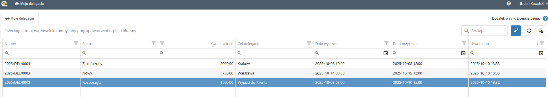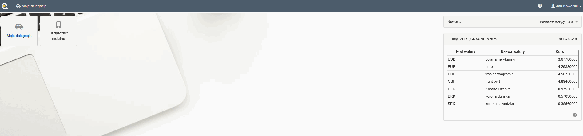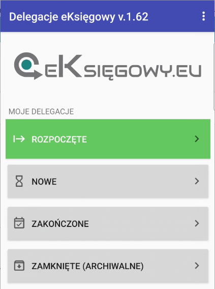 Na ekranie głównym użytkownik może zobaczyć wszystkie swoje delegacje, podzielone ze względu na odpowiedni status.