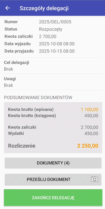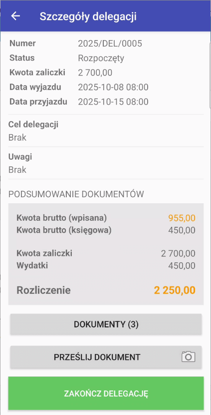 Jeśli jest to delegacja ze statusem "Rozpoczęty" to oprócz podglądu dodanych dokumentów, można zakończyć delegację oraz dodać nowe dokumenty.
