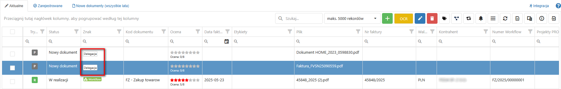 Spowoduje to utworzenie nowych dokumentów w module "Dokumenty Księgowe" w zakładce "Aktualne". Takei dokumenty mają oznaczenie, że pochodzą z delegacji.