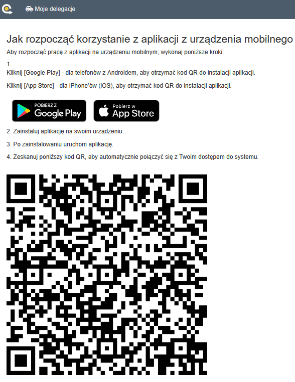 Po zalogowaniu się na pulpicie są widoczne dwa kafelki. Do ściągnięcia aplikacji mobilnej i zalogowania się w niej, oraz do zarządzania swoją delegacją poprzez przeglądarkę.