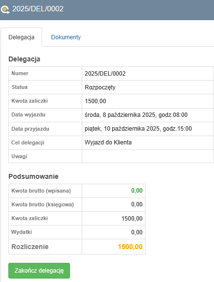 Po otworzeniu delegacji, na zakładce "Delegacja" użytkownik widzi podsumowanie delegacji i jeśli ta delegacja ma status "Rozpoczęty" może ją zakończyć.