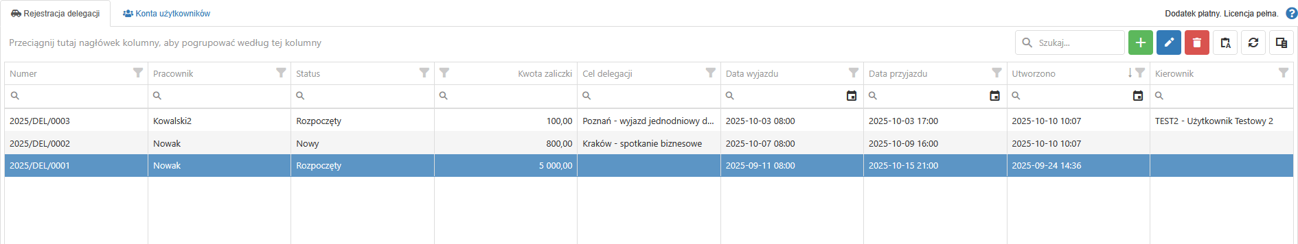 - Dostęp pełny - możliwość dodawania, edycji, usuwania delegacji wszystkim użytkownikom; zarządzanie użytkownikami