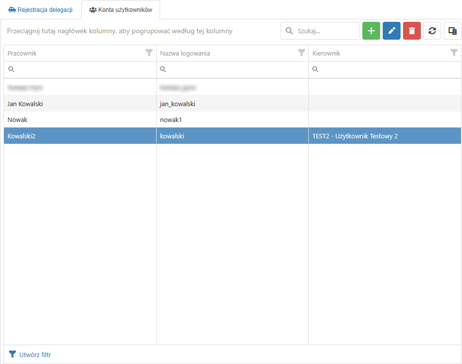- Kierownik - możliwość dodawania, edycji i usuwania delegacji tylko dla użytkowników dla których jesteśmy przypisani jako kierownik