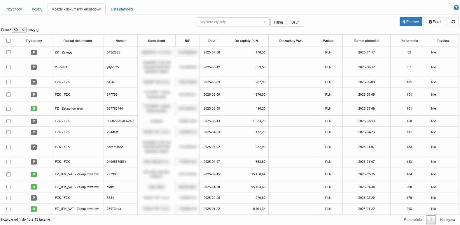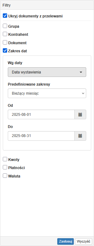Generowanie przelewu - przelewy generowane są z listy dokumentów i zapisywane w raporcie do obróbki oraz zapisu w systemie księgowym.