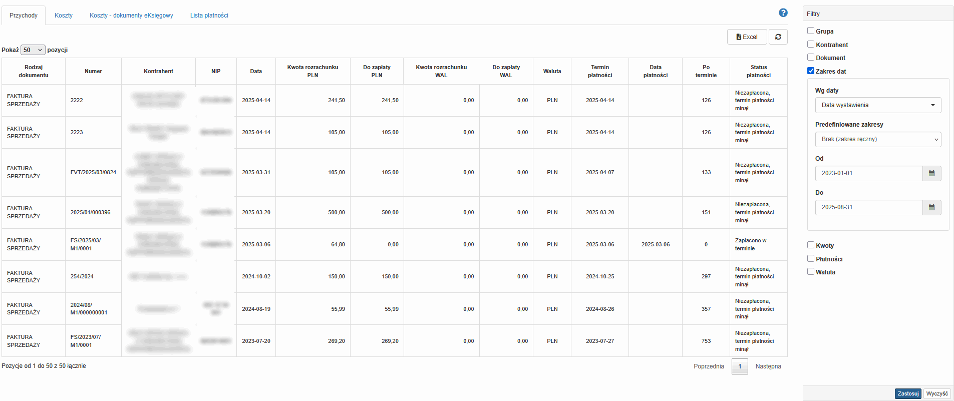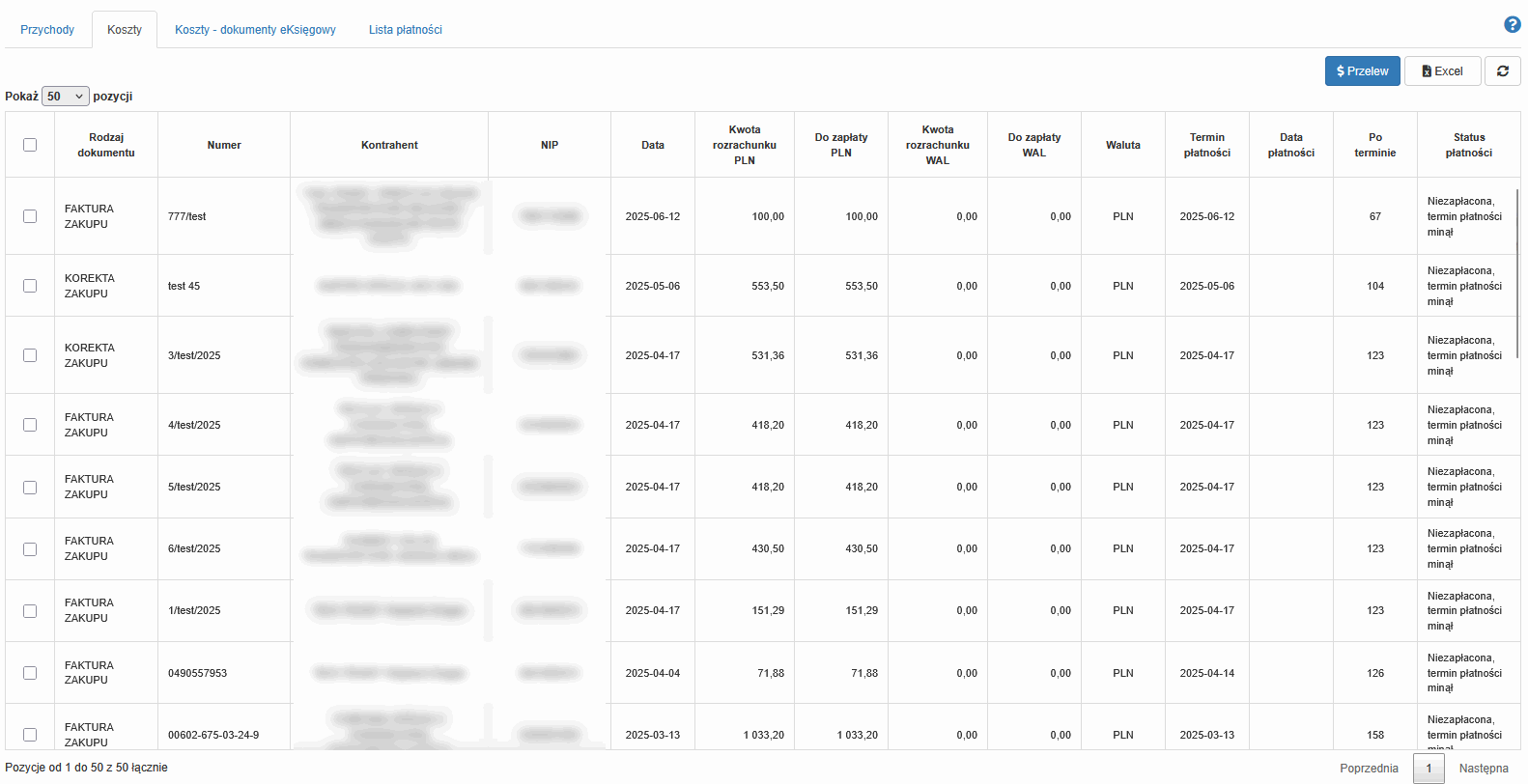 - koszty - dokumenty, które pochodzą z systemu księgowego, dla których mają zostać wygenerowane przelewy za pośrednictwem programu eKsięgowy