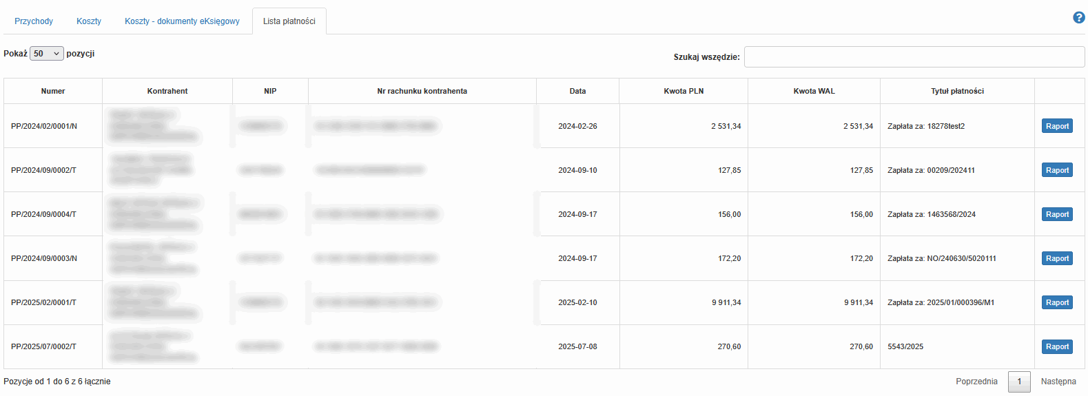 - lista płatności - wszystkie przelewy zarejestrowane w systemie księgowym. W tym miejscu znajduje się raport z wygenerowania przelewu, w którym zapisane jest konto bankowe biorące udział w płatności, zaznaczone odpowiednim znacznikiem.