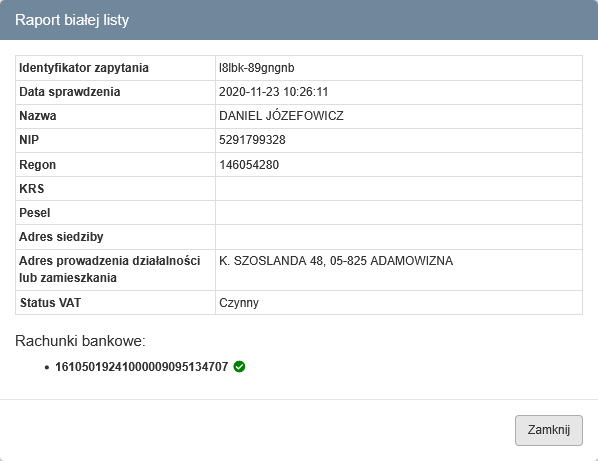 otworzy się okno zawierające raport sprawdzenia kontrahenta z białą listą oraz jego statusem. Wszystkie sprawdzenia są rejestrowane w kartotece kontrahenta w historii sprawdzeń.